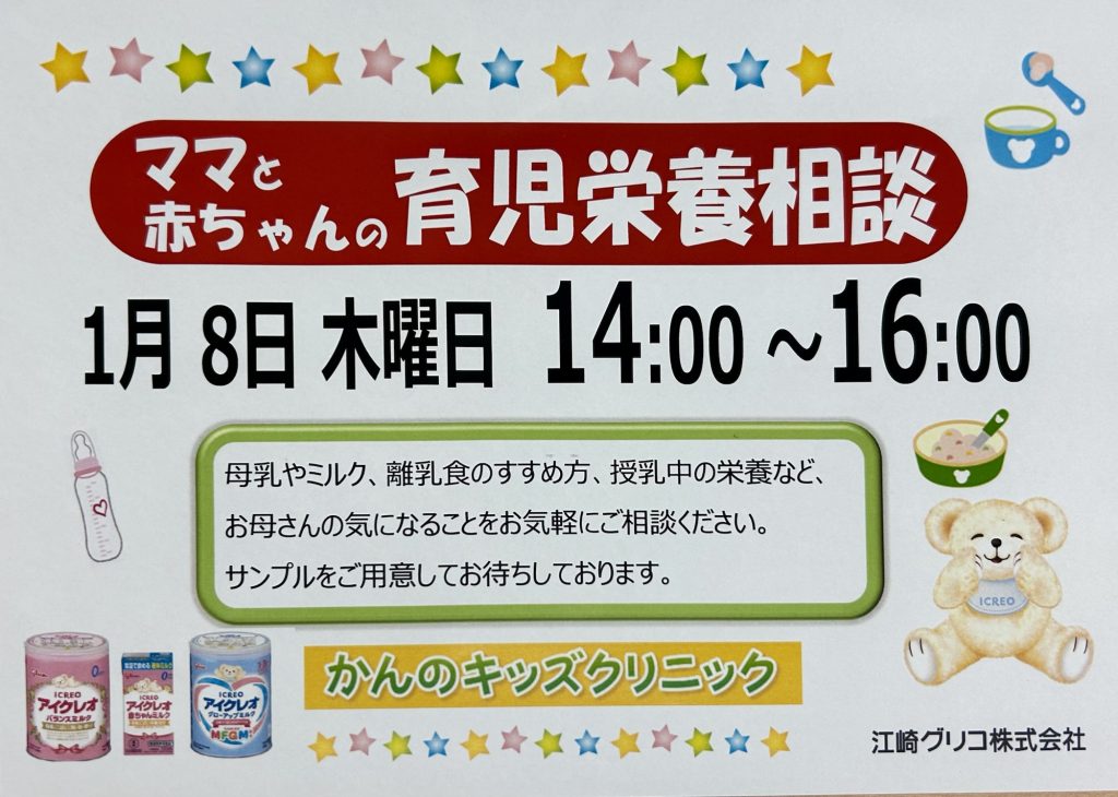 1月の育児栄養相談は8日木曜日14時からです。育児アドバイザーが担当いたします。育児全般のお悩みがありましたらお気軽にご相談ください。